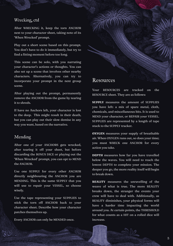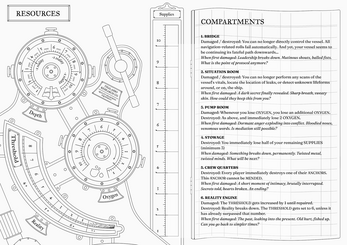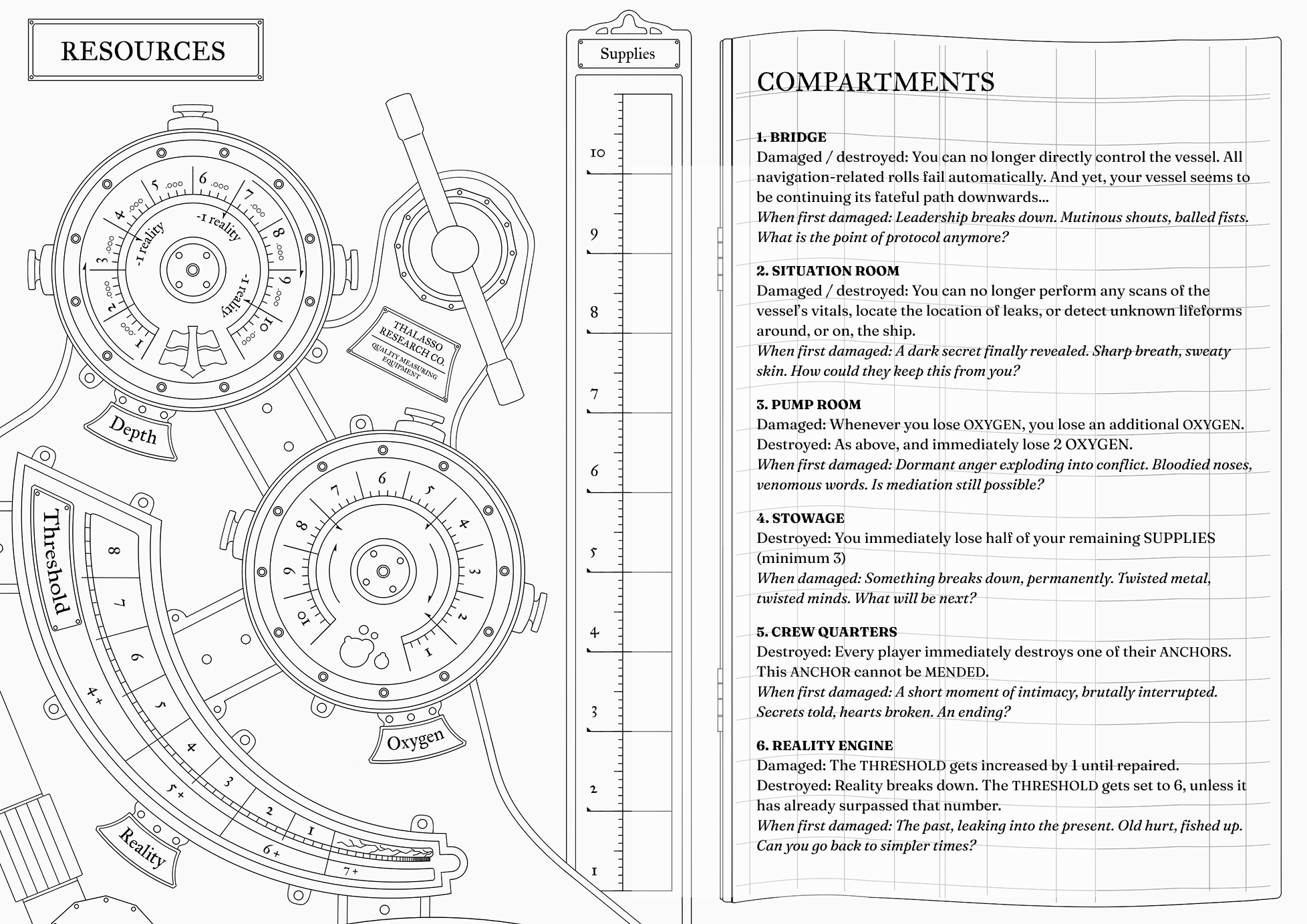 Your crew will have to keep their subnautical vessel in fighting shape as it descends ever further, with tears in the hull being represented by actual tears in the paper. Eventually, the crew's minds will start to rip alongside the hull, making players tear apart their character sheet, even removing access to certain parts of the rules, as their descent into madness continues.