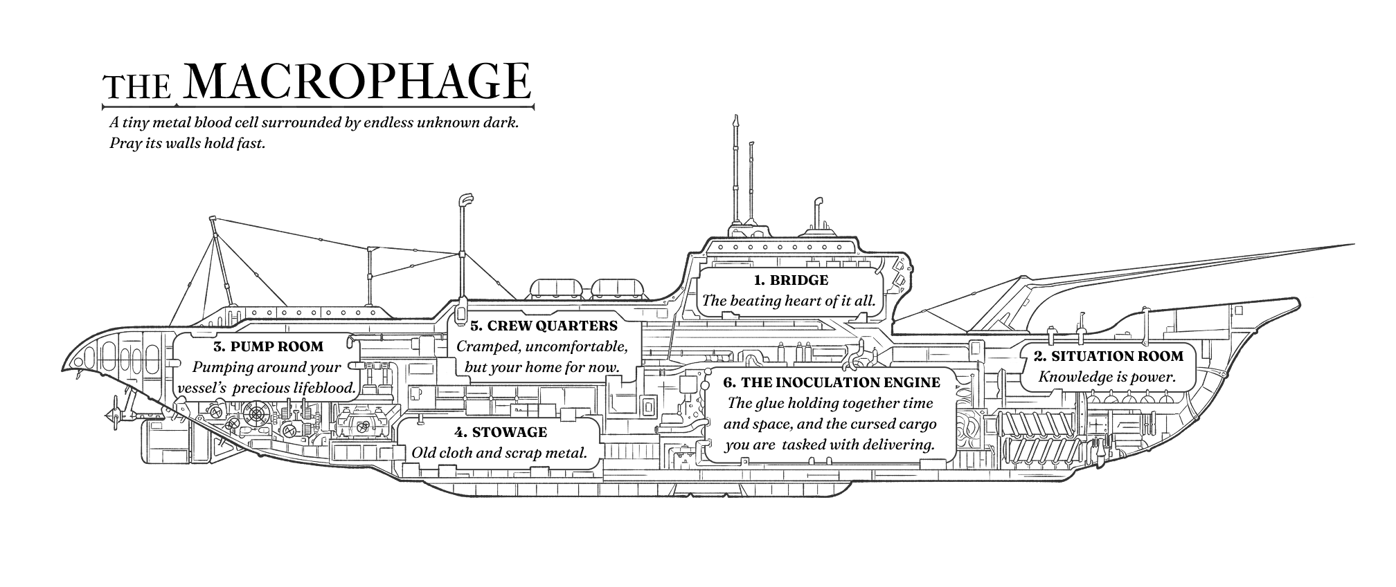The game comes with a module, the Macrophage, that provides everything you need for play. Character sheets, a sheet representing your submarine, and a list of nasty and horrific events for the GM to throw at you. Next to no prep required!