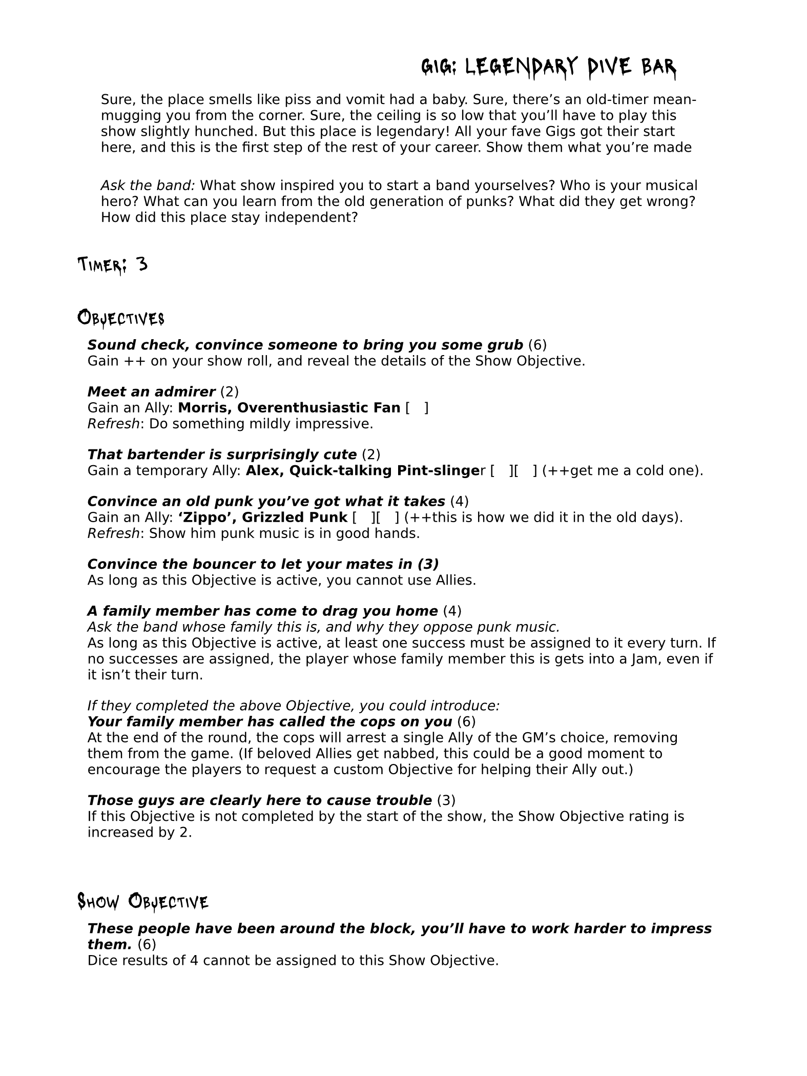You, and a couple of your friends, will portray the members of a punk band going on their first proper tour. You’ll play gigs and use your music to spread your message, getting more momentum as you go, until your voices are loud enough to make meaningful change. Maybe make a bit of a mess while you’re doing it.